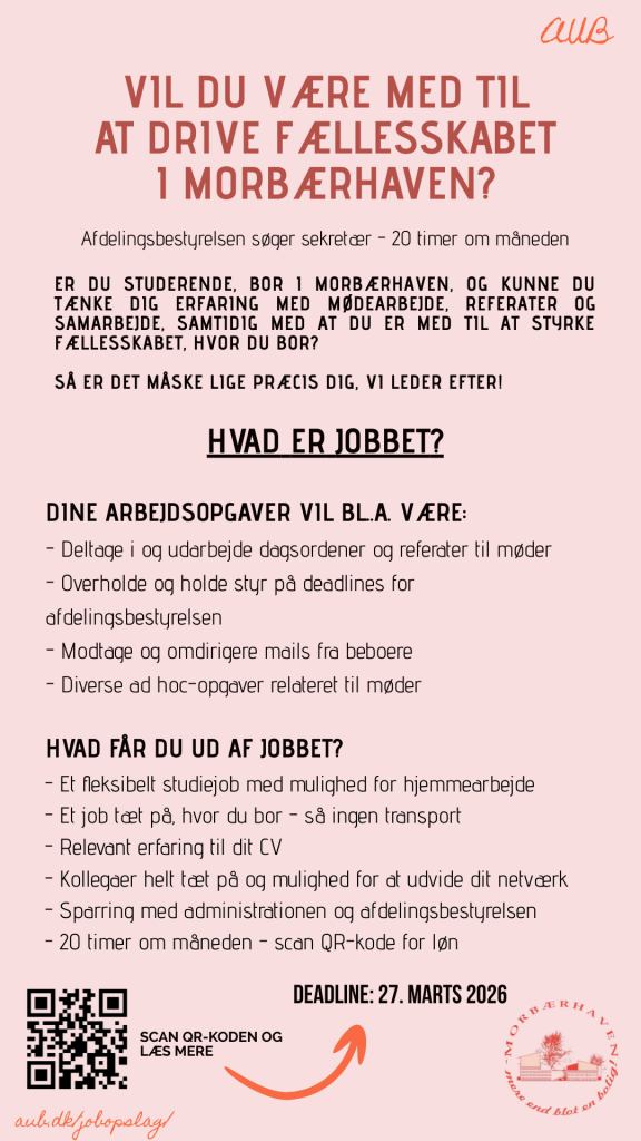 Morbærhavens afdelingsbestyrelse søger en sekretær, som kan hjælpe med at skrive referater, holde styr på dagsordner og understøtte bestyrelsens arbejde. Du bliver en del af et lokalt fællesskab og får indblik i, hvordan initiativer og beslutninger bliver til.